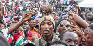 A participant follows proceeding with a hawk on his head during the Gen-Z Shujaaz Memorial concert on July 7, 2024 at Uhuru Park in Nairobi.