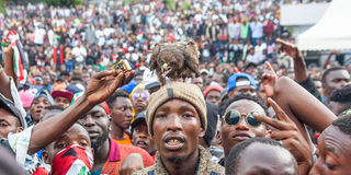 Participants follows proceeding with a hawk on his head during the Gen-Z Shujaaz Memorial concert on July 7, 2024 at Uhuru Park in Nairobi.