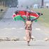 A female protester jumps over a bonfire as she flees from anti-riot police officers at Free Area, along Nakuru-Nairobi highway on July 7, 2025.