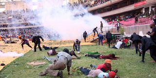 Former Prime Minister Raila Odinga's supporters take cover after police officers lobbed tear gas to disperse them as they demanded to view his body at Kasarani Stadium in Nairobi on October 16,2025.