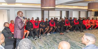 President William Ruto addresses members of Harambee Stars squad on Monday at Pullman Hotel in Upper Hill, Nairobi. He promised each member of the squad Sh2.5 million should they beat Zambia on Sunday in final Group 'A' match of 2024 African Nations Championship.