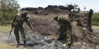 Security officers outside one of the houses torched as members of the Maasai and Kipsigis communities fought at Pimbinyiet in Trans Mara West, Narok County in 2017. Fresh clashes broke out this week.