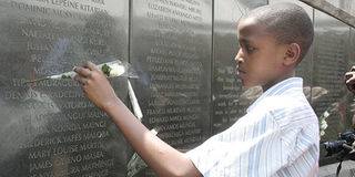 Michael Macharia points his father's name during the 10th anniversary in memory of the victims of the August 7,1998 bomb blast in Nairobi.