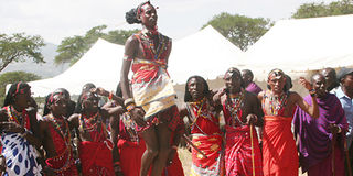 Maasai morans display their dancing skills during a leaders meeting in Kiserian, Kajiado County. T