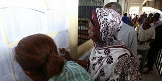 Electorates look for their names on the notice board before queuing to cast their votes during the general election at a polling station in Dar es Salaam, Tanzania, October 29, 2025.
