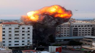 Fire and smoke rise after an Israeli air strike targeted the National Bank on Gaza City, on October 8, 2023.