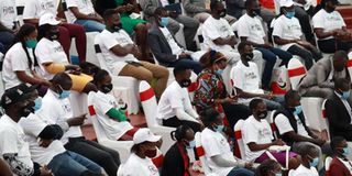 Youths following the proceedings at the Bomas of Kenya in Nairobi during the launch of ‘Kenya ni Mimi’ youth dialogue initiative by President Uhuru Kenyatta on December 7, 2020.