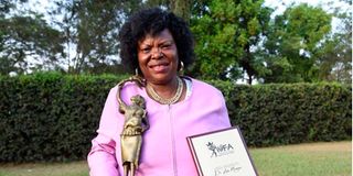 Kenyan film director Dr Anne Mungai with some of her awards during an interview at Kenyatta University.