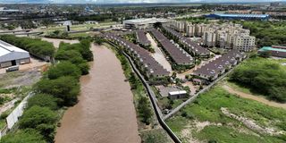 A drone view shows Athi River waters flowing next to the Crystal Park estate following heavy rainfall in Machakos county near Nairobi, Kenya April 24, 2024.