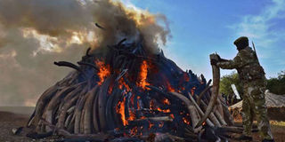 A KWS officer throws an ivory tusk onto a burning pile of 15 tonnes of elephant ivory seized in Kenya at Nairobi National Park on March 3, 2015. Burning the ivory stockpiles is part of a wider conservation strategy to eliminate demand for ivory and put value instead on living elephants. AFP PHOTO | CARL DE SOUZA