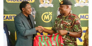 Deputy Inspector General, Administration Police Service Gilbert Masengeli (right) with Mozzart Bet Marketing Manager Frank Ochieng.