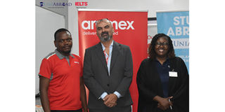 From left: Aramex Kenya Limited Operations Manager Thuo Githaiga and National Sales Manager Tareq Hourani, with UniAbroad Programme Counsellor Stella Kinyanjui.