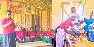 The Chairperson of Sirenga Group in Western Kenya's Bungoma County Edith Mbachi, chats up members as they skillfully process groundnuts into rich, golden peanut butter.