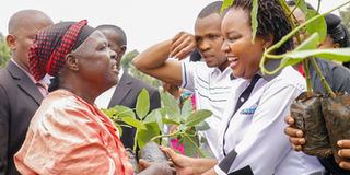 Kirinyaga Governor Anne Waiguru distributing avocado seedlings to farmers.