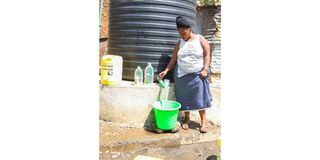 Lucy Wairimu, a resident of Korogocho in Nairobi, fetches water from a tank donated by Safaricom Foundation.