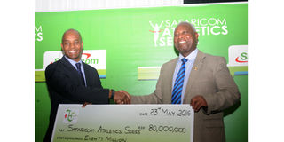 Safaricom Corporate Affairs director Stephen Chege (left) gives Athletics Kenya President Jack Tuwei a dummy cheque of Sh80 million in 2016.