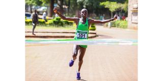 Elkan Yego celebrates as he wins the 2017 Safaricom Kisumu City Marathon, part of the company's athletics series.
