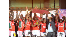 Kenya Shujaa players and Kenya Rugby Union chairman Richard Omwela at the end of the 2016 Safari Sevens rugby tournament.