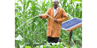 A farmer in Machakos uses a solar-powered pump to water his crops.