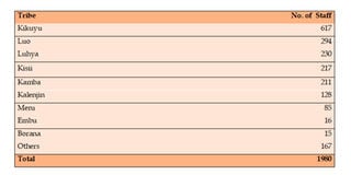 Staff ethnic representation: The Nairobi Hospital is a national asset and one of Kenya’s heritage brands. Because of this distinction, nearly all ethnic communities are represented in our staff establishment as shown in the following pie chart: