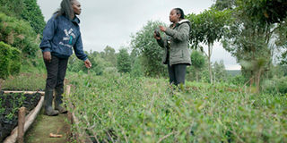 Grace Wacu (right), Project Officer at KENVO, speaking with Teresa Muthoni of TerraFund, at the KENVO tree nursery site in Kieni Forest.