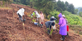 Farmers planting trees at Compartment 8G, one of KENVO's allocated restoration sites in Kieni Forest, under the TerraFund project.