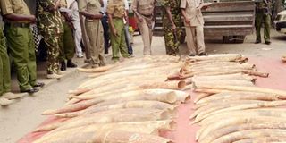 Mombasa County Commissioner Nelson Marwa (right) and KWS Assistant Director Arthur Tudor among other officers inspect 228 pieces of ivory at Makupa Police Station. The ivory were found at a warehouse in Tudor area in Mombasa County on June 5, 2014. PHOTO | KEVIN ODIT | NATION MEDIA GROUP