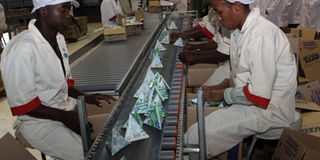 Brookside Dairy workers pack milk into boxes. Kenya Dairy Processors Association chairman Nixon Sigey said the high cost of production in Kenya is making the country’s milk uncompetitive in the export market. PHOTO | FILE