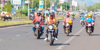 Boda boda riders weave through in Kisumu along Kisumu - Kakamega highway on November 12, 2025. E-Safiri and other innovative transport initiatives are steadily rolling out cleaner, electric options, driving the city toward a smarter, greener urban mobility future.
