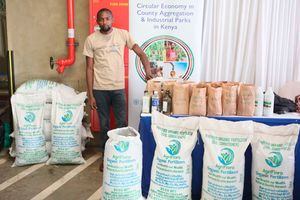 Odigo Jason of Harvester Road Organics displays a container of AquaGro Liquid Fish, an organic biofertiliser made from processed fish waste, at the Kenya Industrial Research and Development Institute (KIRDI) Complex in Kibos, Kisumu, on October 24, 2025.