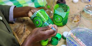 A worker decorates cut glass bottles at MokoMaya Home Décor workshop in Dagoretti, Nairobi on August 6, 2025.