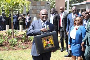 National Treasury Cabinet Secretary John Mbadi displays his briefcase before the reading of the National Budget on June 12, 2025.