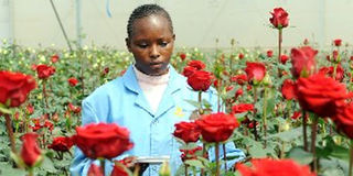 Flower scouter Ms Anastasia Mutheu inspects flowers in a greenhouse at Preesman, a flower breeding farm at Njoro in Nakuru.