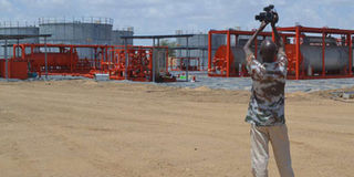 A journalist takes a clip of oil storage tanks at Ngamia II oil fields in Lokichar, Turkana County, May 25, 2018.