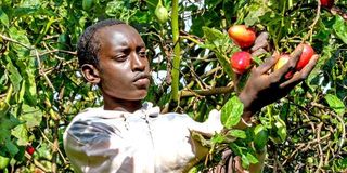 Elisha Lemiso harvesting tree tomato fruits at his farm in Mariashoni, Molo in Nakuru County.