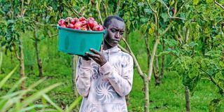 On this bright day, we find Elisha Lemiso, an 18-year-old Form Three student at Rombei Day Secondary School in Mariashoni, Molo sub-county, Nakuru County, harvesting tree tomato fruits.