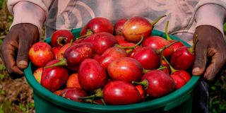 A Form Three student, Elisha Lemiso, 18, displays some of the tree tomato fruits harvested from his portion of land in Mariashoni, Molo in Nakuru County.