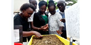 Joyful Women Group members get a feel of the maggots hatched from Black Soldier Flies ICIPE, Nairobi, on October 18, 2023.