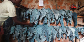 Fish skin tanned into leather is dried at Newton Owino’s mini tannery in Mamboleo, Kisumu. PHOTO / TOM OTIENO