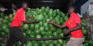 Workers offload watermelons sourced from Oloitoktok in Elburgon town, Nakuru County. Most of the produce is brought in by brokers.