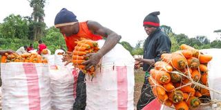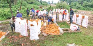 Labourers pack carrots in sacks in Nessuit, Njoro Sub-County after washing them in a river on August 21, 2025.