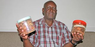 Prof Albert Luvanda, head of the Kenya Forestry Research Institute’s arid lands station in Kitui, holds cans containing resin and gum. He advises that gum and resin should be used shortly after harvesting so that they do not lose their value.