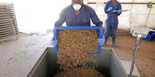 An employee empties a container full of black soldier fly larvae before they are weighed at the Sanergy organics recycling facility near Nairobi. PHOTO | REUTERS