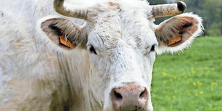 The typical Charolais is white in colour with a pink muzzle and pale hooves. They are born with horns, therefore, dehorning is necessary for easy handling.