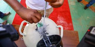 A semen storage tank during the flagging off of the Girolando embryo consignment from Brazil.