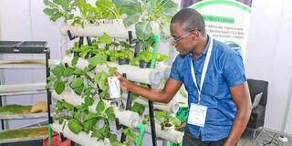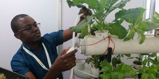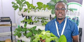 Derick Mugodo, the founder of AgriPlant Kenya, a youth-led company in Nairobi that manufactures automated vertical hydroponic systems for urban farming, shows some of the crops grown using the unit.