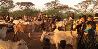 Locals and their livestock at Kibish center water point near the border of Kenya and Ethiopia. Drought is fueling conflicts among locals as water sources continue to reduce due to lowering water table.