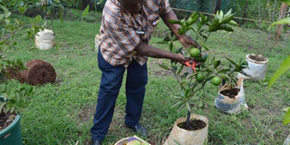 Samuel Manene harvests produce from his movable orchard in Kasarani. Mr Manene grows oranges, mangoes and apples in polythene bags in a technique that sees him harvest big from his quarter-acre PHOTO | ERIC WAINAINA | NATION MEDIA GROUP