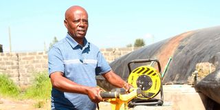 Francis Mwangi, the owner of Joy Farm Lanet in Nakuru County, inspects the bio digester that enables him to carry out sustainable agriculture.