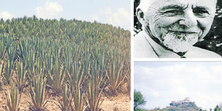 Clockwise from left; A sisal plantation near Makongeni Primary School in Rongai, Nakuru, Ewart Scott Grogan, who is the pioneer of sisal farming in the country having mainly grown the crop in Taita Taveta, and Grogan's castle, his home on Taita Taveta County. FILE PHOTOS | NMG